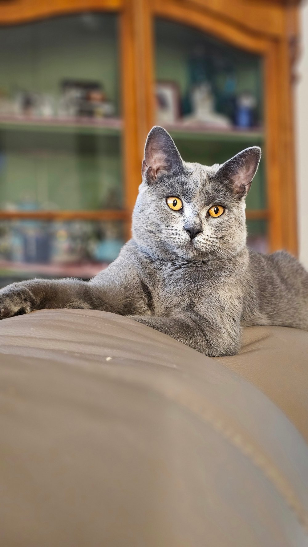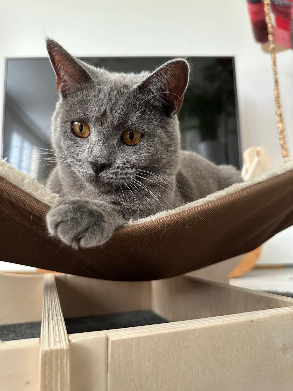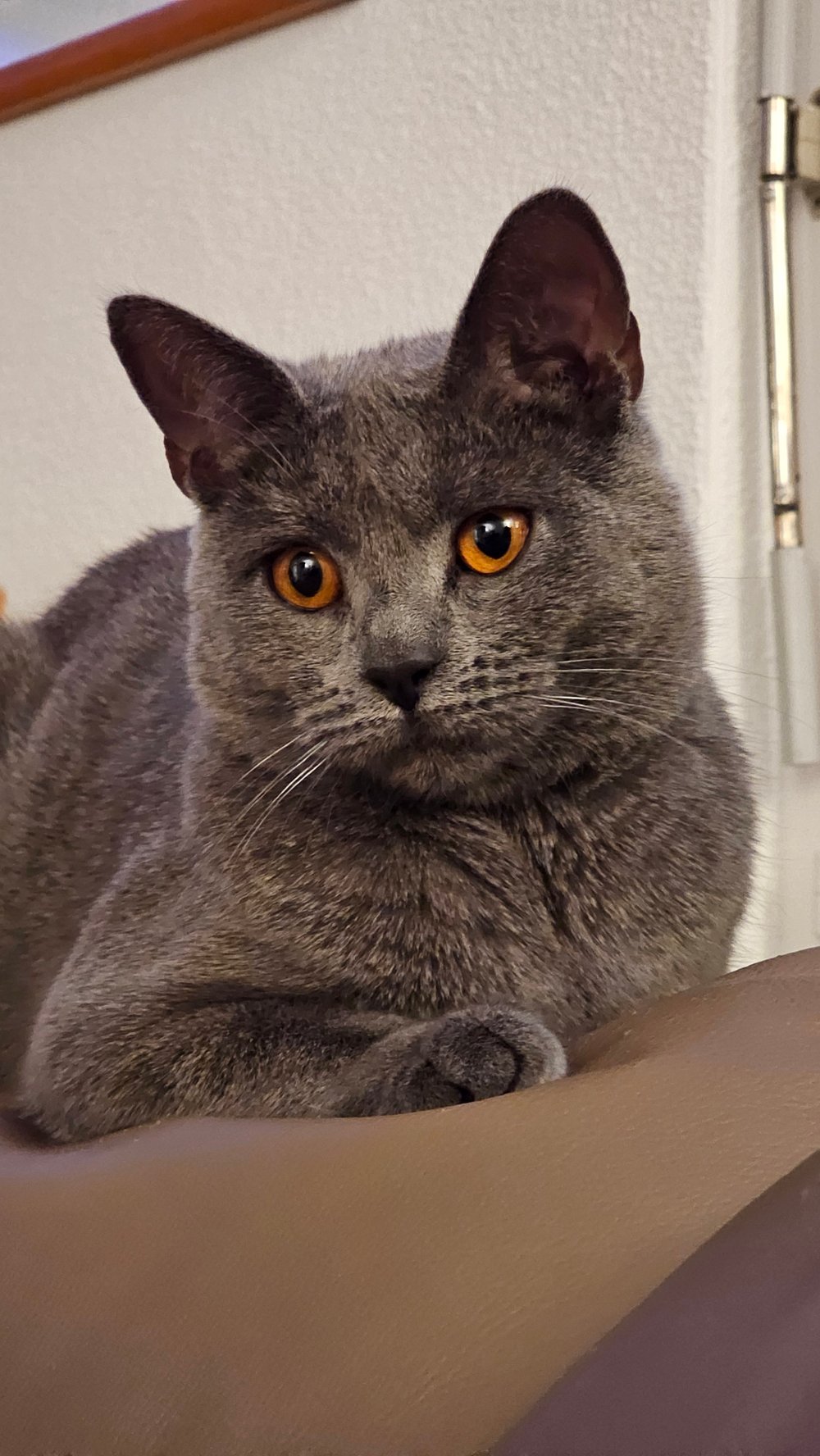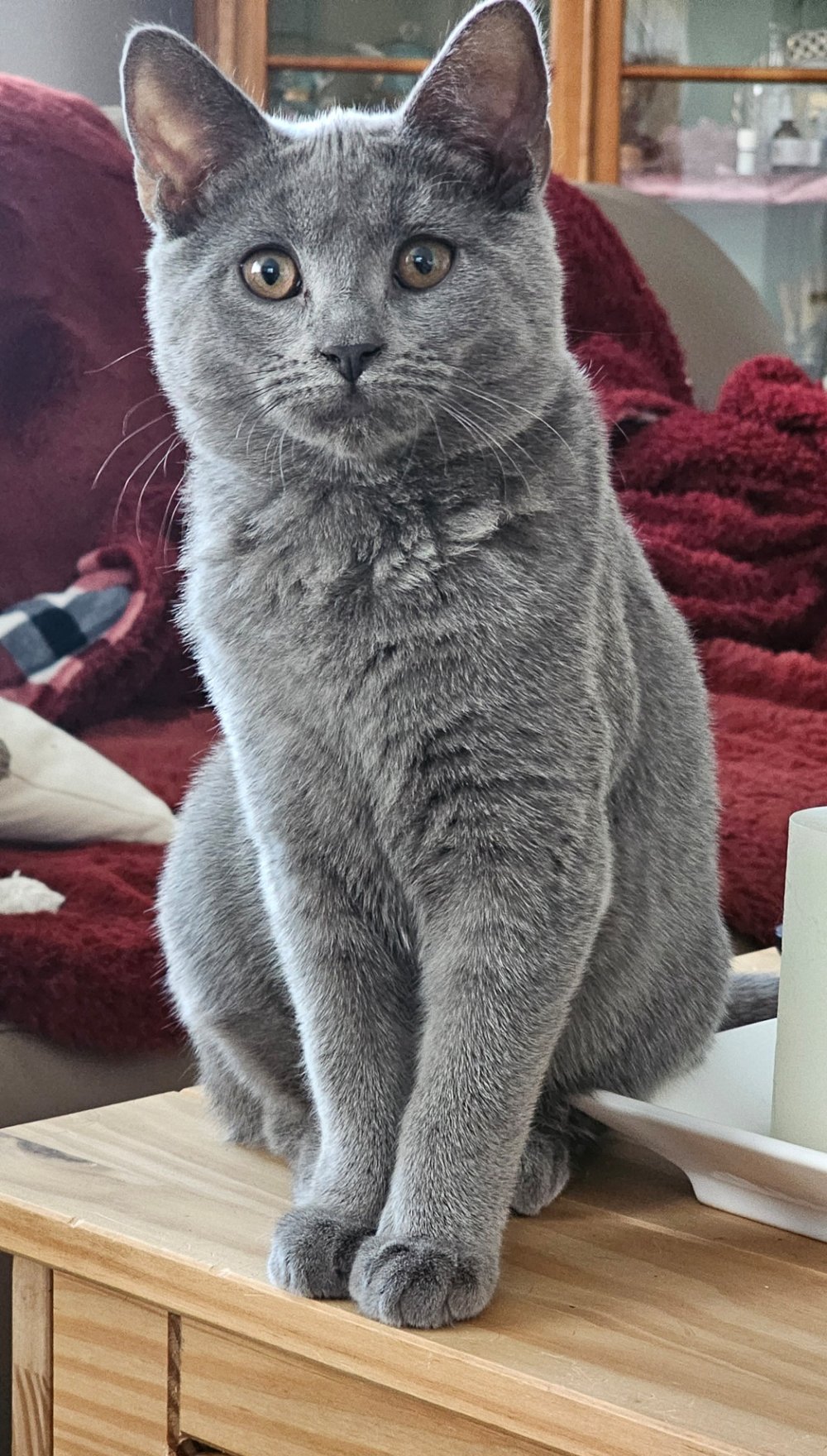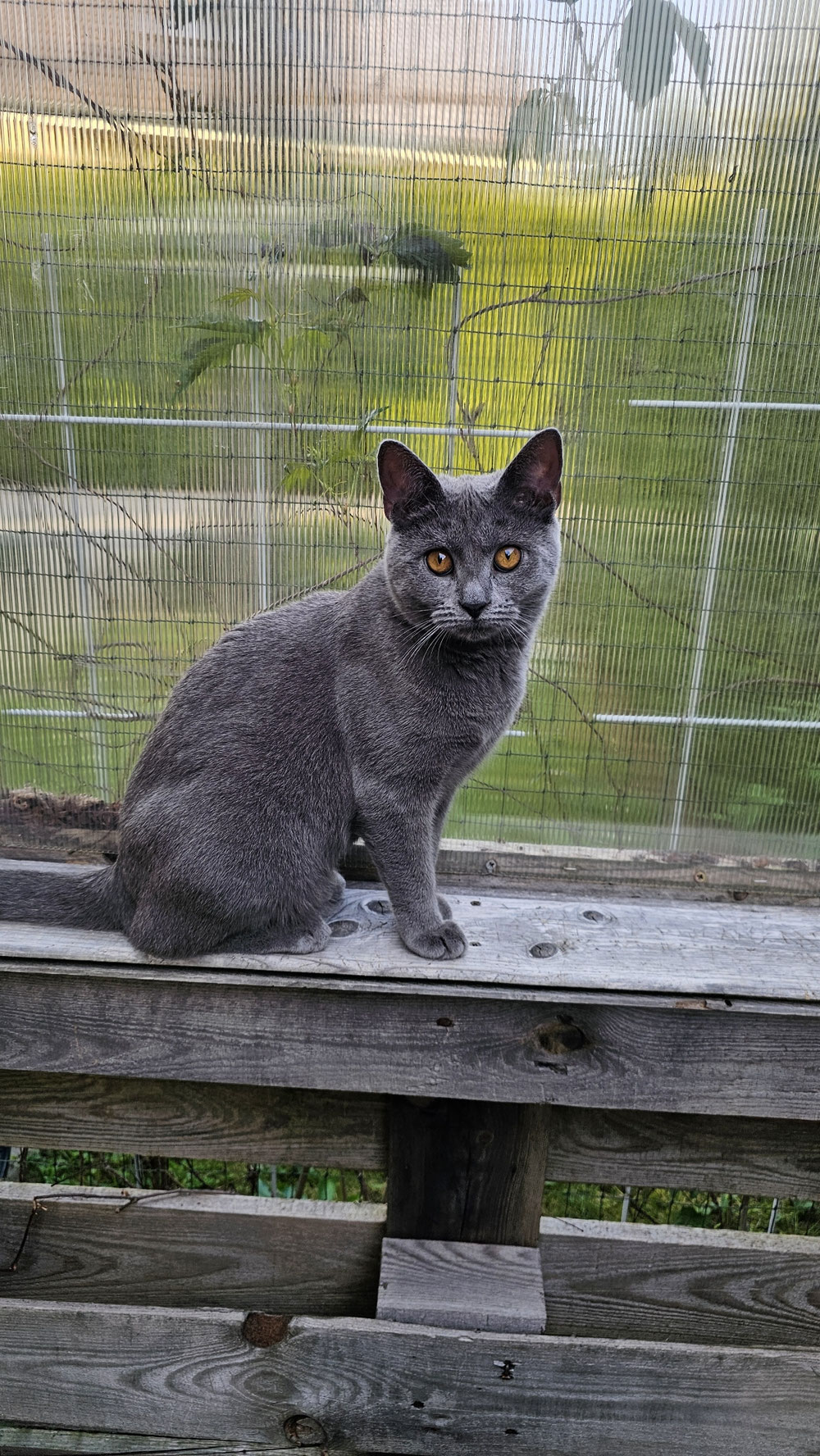 Unsere bezaubernde Vivien vom Bernsteinfeuer ist eine wahre kleine Königin – mit einem sanften Wesen, strahlend kupferfarbenen Augen und dem typischen, samtig-blauen Fell, das die Chartreux so unverwechselbar macht.